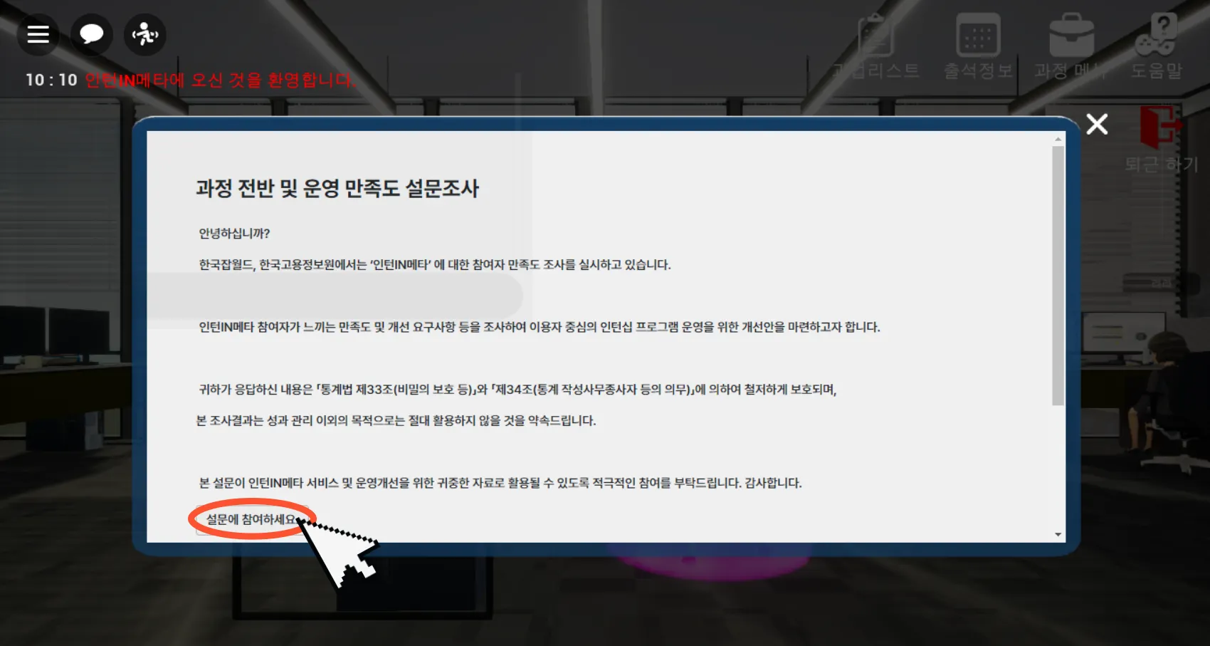 설문조사 페이지 하단 [설문에 참여하세요.] 버튼을 클릭해서 설문조사에 참여합니다.